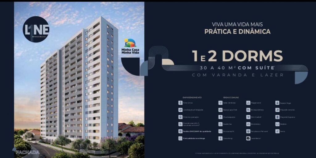 Apartamentos a partir de 30 m² com 1 dormitório, sala, cozinha e 1 banheiro.
